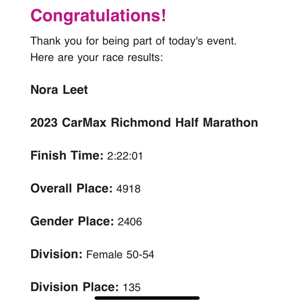 The finish of Richmond is a downhill and I kept waiting for it to come. It’s very late in the race, but you can’t miss it when you get there. I crossed the line fairly confident that I had made my goal but not wanting to declare a victory until I had the official results. So I accepted my medal and made my way out of the chute to try to find Jp. I did see him anywhere so I decided to go to pick up my drop bag and keep looking. Just after I retrieved my bag he called me and we were able to find each other in the crowd. We went to pick up our additional swag (a blanket and a hat) and then navigated the crowds of finishers who had stopped for pizza or beer. When we were most of the way through the park my phone dinged with my official results. I had done it! Yes, I technically broke my PR at the Crawlin’ Crab. But I broke it more officially at Richmond.
